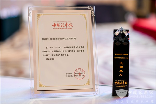 2020年12月22日,由《中国汽车报》社主办的“车轮上的中国——中国商用车助力全面建成小康社会”年度盛典在北京举行,厦门金龙联合汽车工业有限公司(简称“金龙客车”)荣获“大国基石”奖项,其中,5G智能网联纯电城市公交车——智慧城市之光凭借优异的产品性能表现荣获“高效出行专家”奖项。