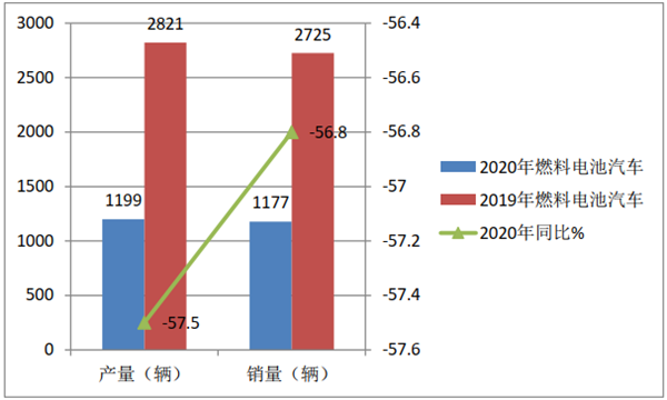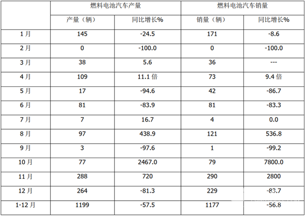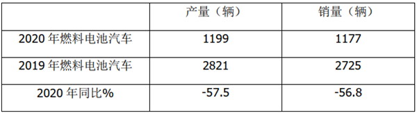 根据中汽协数据,2020年燃料电池汽车产销同比统计: