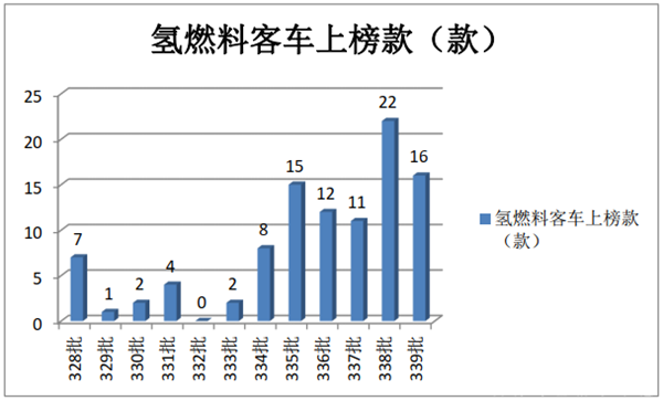 上图表可见,在2020年工信部累计发布的12个批次汽车新品公告中,燃料电池新品共计上榜100款,其中第338批公告上榜的燃料电池客车车型数量最多,达到22款,占据该批次发布客车新品数量的26.2%,为2020年各批次中占比最高。