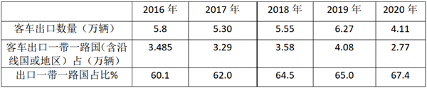根据海关数据统计,2020年及近年我国客车出口一带一路国家占比: