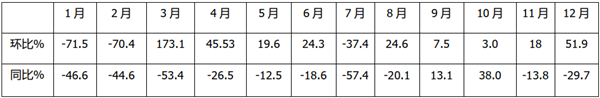 只有9月和10月两个月份实现了环比、同比双增长;单月销量环比最大的是3月;单月同比增幅最大的是11月;1-12月中同比增长的只有9月和10月,其余10个月均下降;1-12月中环比增长的有9个月,有3个月是下降的。