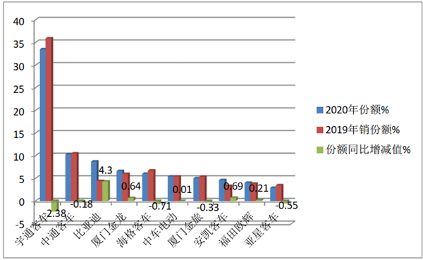 从上图表看出,在2020年6米以上大中型客车top10市场份额竞争中呈现以下特点:
