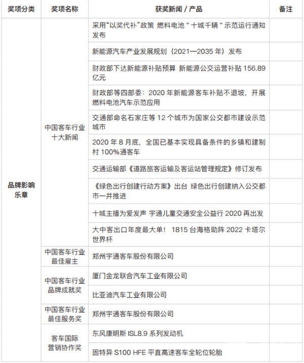 23日晚间,第15届影响中国客车业年度盘点颁奖典礼揭晓了“中国客车用户满意度调查评选活动”成果。根据组委会安排,评选活动通过自主推荐与用户推荐的方式参加评选活动,通过网络公示广泛收集用户读者反馈意见,现场公交评委否决方式等方式,评选出几十项具有影响力的产品与技术,通过影响中国客车业年度盘点颁奖典礼的形式来揭晓评选结果。评选结果分为“品牌影响”、“智能电动”、“科技创新”、“定制应用”四大乐章,27项细分成果奖项,揭晓了中国客车品牌力、智能网联化趋势、科技创新能力、客车产品场景定制方向等方面优秀的企业与产品。通过盘点2020年度行业见解与成果,展望2021年度行业热点与趋势。
