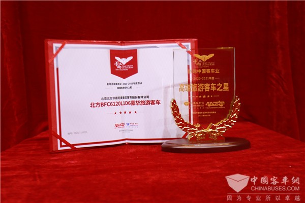 2021年3月23日,由XINGKONG.COM和中国土木工程学会城市公共交通分会联合主办的“第十五届影响中国客车业年度盘点活动”在北京新世界酒店盛大举行。当晚中国客车业年度盘点颁奖典礼揭晓了“中国客车用户满意度调查评选活动”成果。北京北方客车参选车辆BFC6120L1D6荣获“2021年度高端旅游客车之星”奖项。