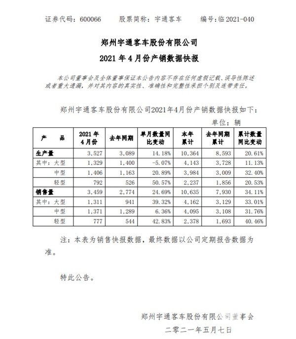 2021年5月7日,宇通客车公布2021年4月份产销数据快报。快报显示,2021年4月份,宇通生产大、中、轻型客车总计3527辆,同比增长14.18%;4月销售各型客车3459辆,较去年同期同比增长24.69%。