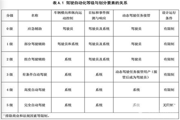 根据美国汽车工程师学会标准,自动驾驶按照汽车控制权及安全责任分配可分为不同五个级别:0级为完全驾驶员驾驶,完全由人来操作汽车,可以得到保护系统辅助和警示;1级为辅助驾驶,通过驾驶环境分析,可以对方向盘和加减速度其中一项辅助控制;2级为部分自动化驾驶,对方向盘和加减速度等多项操作提供辅助控制;3级为特定条件下自动化驾驶,汽车可进行自动驾驶,需要人提供一定操作;4级为高度自动化驾驶,汽车可进行自动驾驶,人不一定需要提供操作;5级为完全自动化驾驶,不需要人为操作。