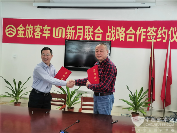 2021年4月15日,北京新月刘长青董事长、刘长江总经理一行莅临厦门金旅考察参观,厦门金旅董事长、总经理彭东庆、副总经理赖志艺陪同接待。双方本着平等互利、优势互补的原则,经友好磋商,于4月16日签订战略合作协议,结成长期、全面的战略合作伙伴关系,在未来五年内客车采购首选金旅客车,其中2021年度第一批采购100辆领航者于6月交付,第二批160辆领航者于年底交付。