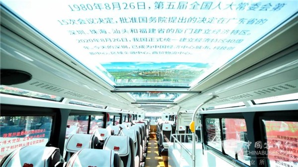 本次比亚迪纯电动双层观光巴士的“全妆焕新”,旨在打造沉浸式党史教育移动阵地。其中,“改革开放号”充分利用车内休闲吧台、全息沉浸式投影技术、5G+VR等设备,围绕“红色文化”宣传,专设读书角、拍照打卡等功能区,配置车票打印、空气成像、全息投影、光明网联播屏等设施;车窗应用超透材料做成了改革开放史、中国共产党历次全国代表大会、东江纵队革命历程等主题的宣传展板,在学习党史知识的同时,也可欣赏深圳城市美景。