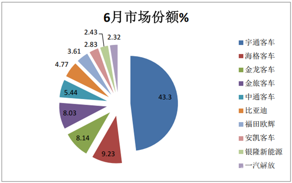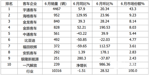 ●6月主流客车企业销量:“两通三龙”居前五,宇通占比超4成,再度强势霸榜,银隆大涨280%,TOP10中同比7增3降