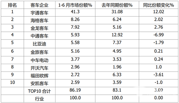 上图表显示,在2021年上半年大中客车TOP10市场份额及同比份额变化情况: