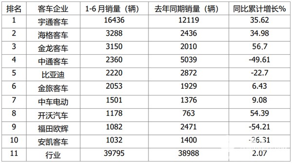 宇通累计客车销量16436辆夺冠,也是行业销量唯一超出15000辆级别的企业,是第二名销量的5倍,一骑绝尘,宇通在大中型客车的霸主地位无人能撼动;海格累计客车销量3288辆,同比增长34.98%,位居第二;金龙客车累计销量3150辆,同比增56.7%,位居第三;中通客车累计销量2360辆,同比下降49.61%,位居第四;比亚迪客车累计销量2220辆,同比下降22.7%,位居第五;金旅客车累计销量2053辆,同比增长6.43%,位居第六;上述可见,在今年上半年的大中型客车领域,业内传统的强势品牌“两通三龙”+比亚迪,占据了行业前6名的席位,而且累计销量超出2000辆。