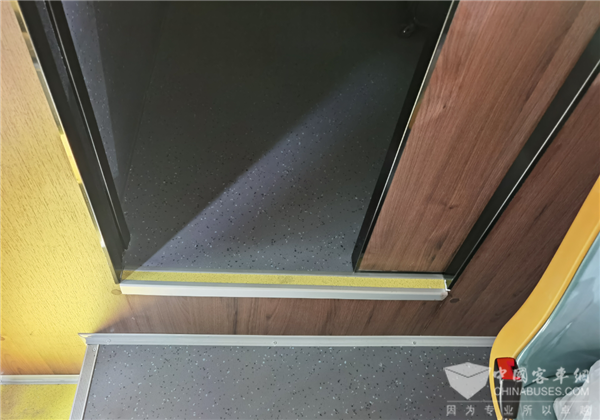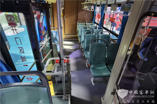 车厢中部设有11个乘客座,前部副驾驶1个正向乘客座,整体为典型的城乡公交车双排座椅布局形式。二级踏步,安装32寸LCD导乘屏、上下客门迎宾灯、USB充电口等设施,并预留有上下车刷卡线缆。