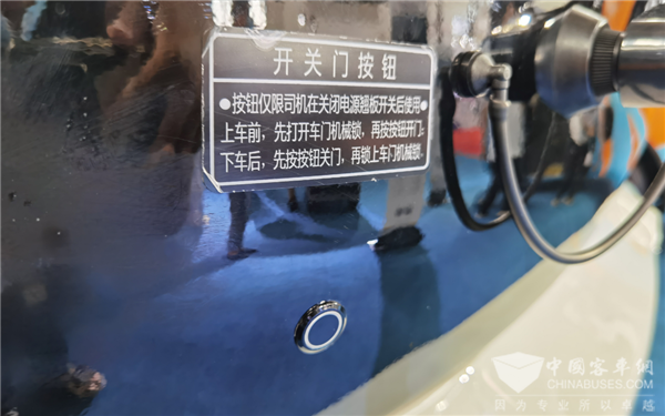 连通常隐藏在前盖板下面的车门开关按钮,金旅北极星都设计得方便智能,通过按钮形式放在了雨刷器下方更加方便操作的醒目位置,还把开启和关闭按钮合二为一,方便智能,简约小巧,这一讨巧的小设计成为了这届展会上的独创。