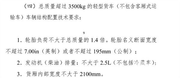 “蓝牌轻卡新规”中最值得关注的是内容是规定今后“总质量超过3.5吨以上轻型货车(不含客厢式运输车)发动机排量不能大于2.5L,货箱内宽尺寸不得大于2100mm, 轮胎负荷不大于总质量的1.4倍、轮胎名义断面宽度不超过7.00in(英制)或者不超过195mm(公制)”。