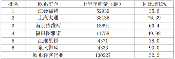 今年上半年欧系轻客累计销量13.02万辆,占据客车市场大盘50.5%的市场份额,占据轻客市场超6成的份额(60.45%),且销量同比增长52.2%,远远跑赢客车大盘39.7%的增幅,也跑赢轻客市场48.6%的增幅,说明今年上半年客车市场的增长主要是由欧系轻客的大幅度增长拉动的。