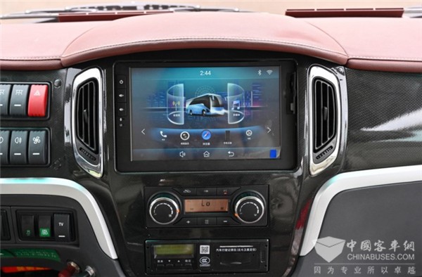在内饰方面,国六升级版考斯特的仪表盘增设了大尺寸液晶屏,中控台也增加了镜面装饰板,并且安装了尺寸为10寸的一体车机,车机集成了导航以及四路监控功能。车机采用了触屏的形式,如果连接WIFI可以播放网络电视。在车机下面是对称的旋钮式自动空调控制面板,面板上带有液晶显示屏,操作起来接近轿车的感觉。在功能和配置方面,国六升级版考斯特相较于早期车型有了较大提升。
