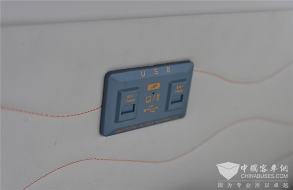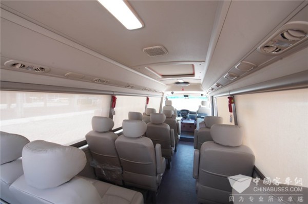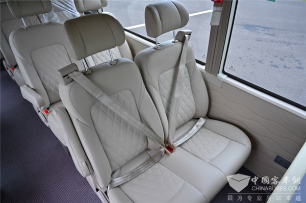 车厢内部采用了1+2的座椅布局,内设14个座椅,每张座椅都带有旋转扶手,可调节的头枕以及独立安全带。座椅采用了皮革材质,也使得内饰更加稳重。座椅侧面安装了双USB充电接口,充电速率为5V/2.4A。