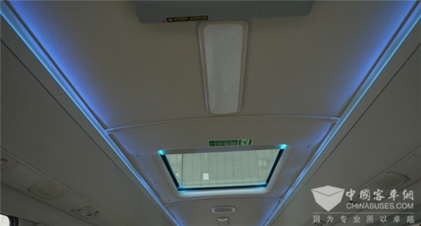 车顶带有天窗,天窗的两边集成了多色可调节的氛围灯条,两条蓝色的氛围灯条贯穿车厢顶部,前后各设置了白色的车内照明灯。