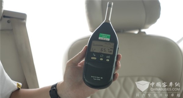 由于考斯特这类中巴车采用发动机前置,理论上在驾驶室前部的噪音是最高的。但是经过测试以后可以看到,车辆在行驶时前部的噪音保持在68分贝以内,直观感受也很安静。车身中部主要是乘客乘坐的区域,噪音控制在66分贝左右。车尾噪音和车身中部噪音接近。