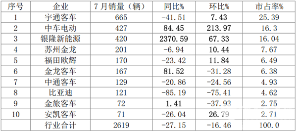 宇通夺冠 中车银隆争第二 2021年7月大中型新能源客车销量同比下降27.15%