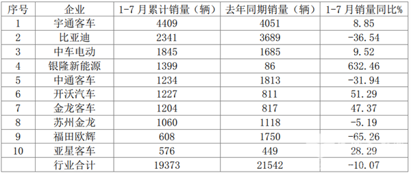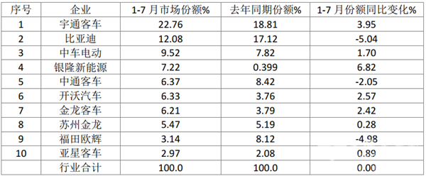 根据中国客车统计信息网数据,2021年1-7月TOP10 企业大中型新能源客车累计销量、同比及市占率: