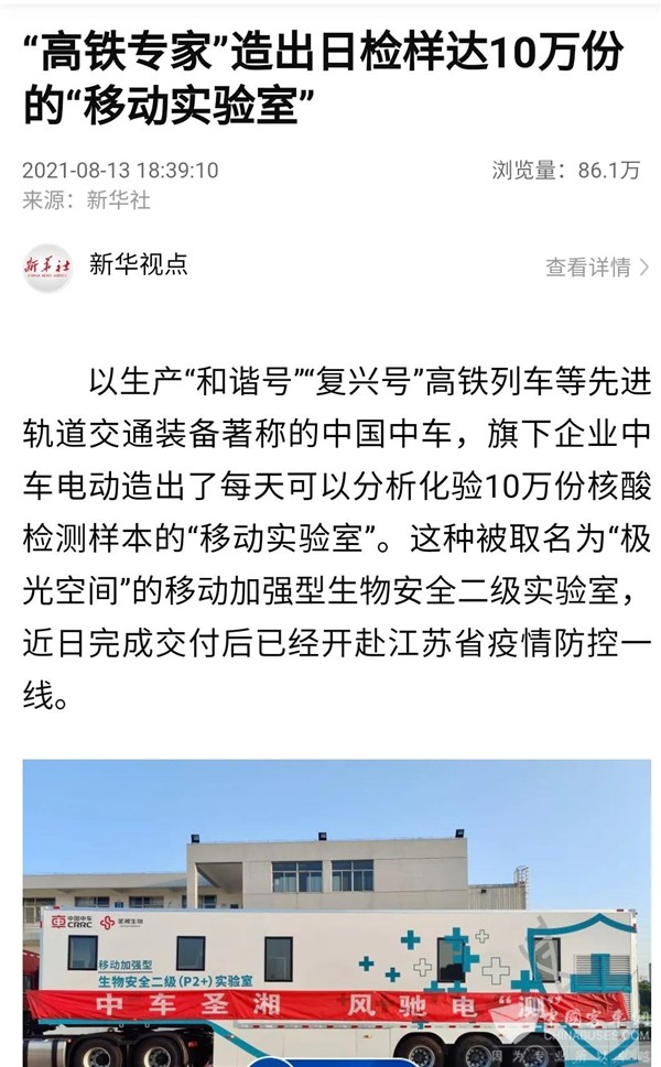 近期,中车电动子公司——无锡中车研发生产的“极光空间”移动加强型生物安全二级实验室奔赴江苏连云港,助力疫情防控......吸引社会各界的广泛关注与点赞。