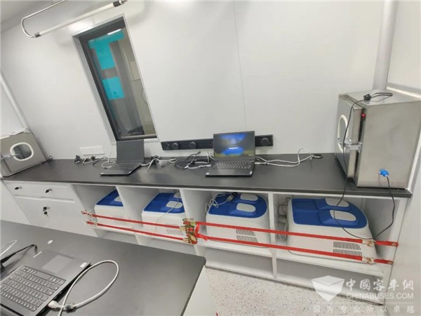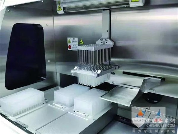 内部配置了自动化样本制备系统、自动化样本分析系统等检测设备,具备自动化样本处理、自动化核酸提取、核酸检测等功能,实现从接收到报告发送全流程自动化、智能化操作,在减少人员接触的同时,大大提高了核酸检测的效率。