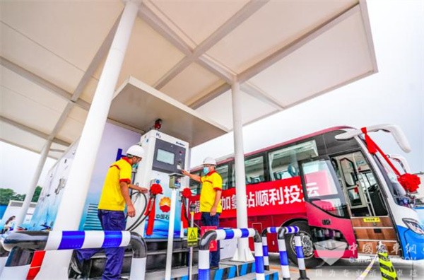 近日,在北京市昌平区加氢站启用仪式现场,一辆福田欧辉氢燃料电池客车缓缓停在加氢站安全岛前,加气员麻利地打开加气口,向车辆加注氢气,仅用5分钟便完成了加氢。