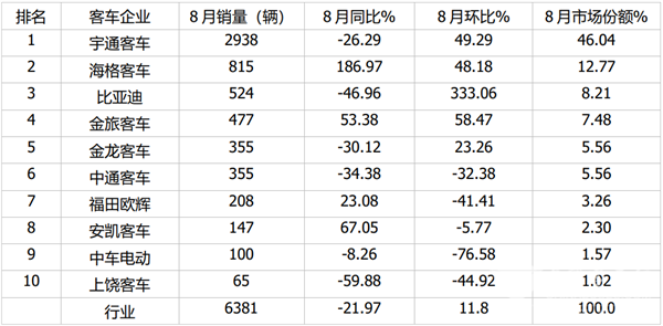 宇通占有率近五成 海格/金旅双增长 比亚迪成倍翻 8月7米以上客车销量出炉