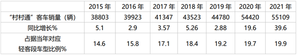 上牌信息显示,2021年1-8月及近年“村村通”小客运市场销量(含5—7米段)及占比统计如下: