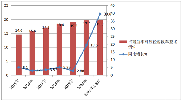 上图表可见,在2021年1-8月,农村客车市场销量55109辆,同比同比增长39.6个百分点,在近年中增幅居最高;占据同类车型轻客市场的比例也达到了19.9%,也是近年最高的。也就是说今年前8月无论是销量同比增幅还是占据轻客的比例,农村客车市场均创近年新高,这是今年前8月农村客车市场一个很显著的市场特征。