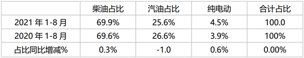 上牌数据显示,2021年1-8月及2020年同期,农村客运市场中销量占比最大的是柴油动力车型,其次为汽油。柴油占比近7成,且同比增加0.7个百分点,纯电动占比最小,但占比同比提升最快。