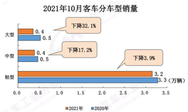 1-10月客车累计销售41.1万辆,同比增长21.6%,比1-9月增幅收窄了4.4个百分点。其中,大型客车累计销量3.5万辆,累计同比下降16.7%,是客车市场中累计同比下降幅度最大的细分车型,环比降幅扩大2.8个百分点。