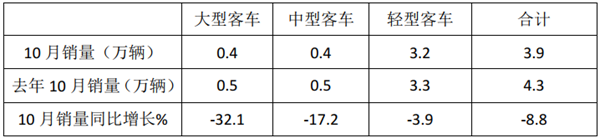 上表显示,10月客车销量同比下降8.8%,商用车大盘10月同比下降29.7%,显然客车降幅小于商用车;1-10月客车市场累计同比增长21.6%,也跑赢今年1-10月商用车大盘(-2.5%)。也就是说,无论是今年10月还是1-10月,尽管客车市场销量并不尽如人意,但仍跑赢商用车大盘。