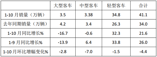 ●1- 10月客车累计销售41.1万辆,同比增长21.6%,轻型客车累计同比成唯一正增长的细分车型