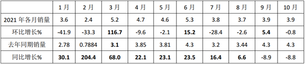 根据中汽协数据统计,2021年1-10月各月客车销售同比增幅:(单位:万辆)