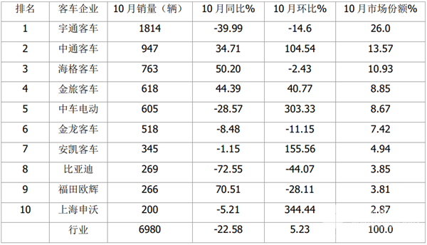 宇通客车10月销量1814辆霸榜,也是行业销量唯一超越1000辆级别的企业,同比下降39.99%,环比下降14.6%,是第二名销量的近2倍,占据的市场份额26%,虽仍然领跑行业,但领先优势逐渐被蚕食;中通客车销量947辆,重回第二,同比大增34.71%,远远跑赢客车大盘,环比暴涨104.54%,是同比、环比双增长的车企,占比达13.57%,表现抢眼;海格客车销量763辆,位居第三,同比增长50.2%,也远远跑赢客车大盘,环比下降2.43%;金旅客车销量618辆,位居第四,同比增长44.39%,环比增长40.77%,也是同比、环比双增长的车企,表现依然较亮眼,市场占比8.85%;中车电动销量605辆,位居第五,同比下降28.57%,环比增长303.33%,相对上月回暖趋势明显;市场占比8.67%。