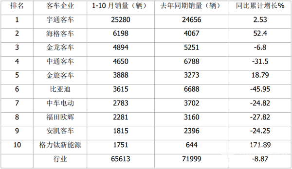 宇通稳居榜首 中通重返第二 金旅“双增长” 10月大中型客车销量出炉
