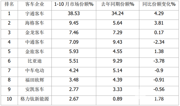 上表显示,在2021年前10月大中客车TOP10市场份额及同比份额变化情况: