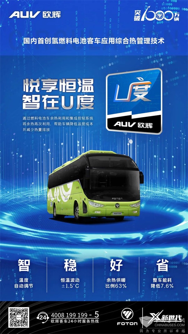 福田欧辉国内首创的氢燃料客车应用综合热管理技术“U度”,不仅有效减少车辆热能损耗,还进一步将整车能耗降低7.6%。U度采用余热利用技术,通过采暖启动、电加热工作、电热供暖、燃料电池启动、接通余热电磁阀、关闭水暖电磁阀以及关闭电加热器七步工作,实现车辆全余热供暖,即使在极寒天气下,也能一路温暖前行。