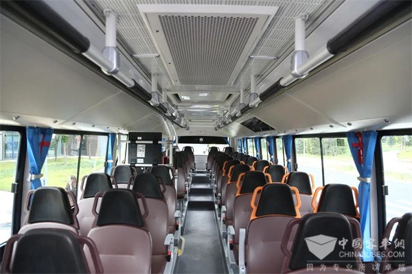 在运营效率方面,BJ6906氢燃料客车搭载福田欧辉独居匠心的三重降耗设计。首先,其采用符合空气动力学设计的10°后倾风挡,可将整车的风阻降低15%;其次,结构紧凑、重量轻、功率高、载客多的动力降耗以及全承载+轻量化车身设计的车身降耗,运行时可实现超过10%的节油率。三重降耗设计不仅让BJ6906运营成本更低,而且大幅提升其续航里程。