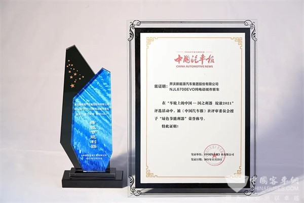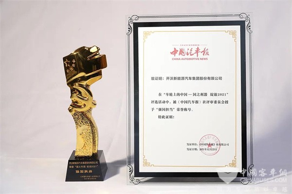 2021年12月23日,为了梳理并表彰我国优秀商用车企业在行业中所作的贡献,树立行业典范,“车轮上的中国——国之利器绽放2021”年度盛典通过线上直播的方式圆满举办。经评审委员会评选,开沃汽车集团被授予“强国担当”荣誉称号,开沃纯电动城市客车——NJL6700EVD也凭借高效节能、绿色智能的优势,被授予“绿色节能利器”的称号。