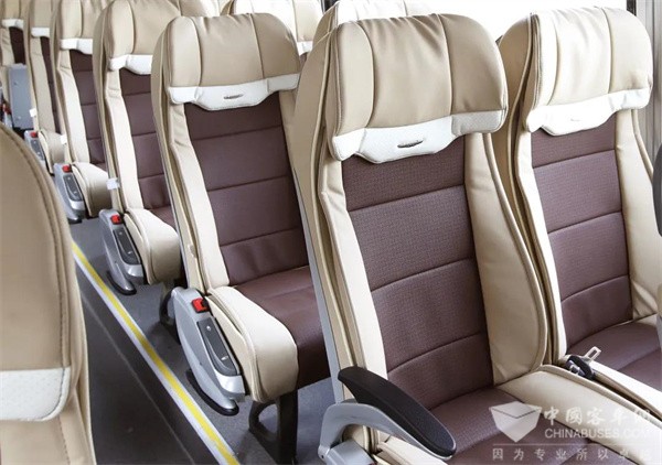 除提升座椅体验外,乘坐视觉享受也是重中之重。为营造温馨、豪华的车内氛围,BJ6122整车内饰采用暖色调,以棕色为主色,辅以米黄及黑白灰,整体配色为乘客带来温馨、高级的视觉感受。除此之外,车内还采用LED氛围灯组布置的航空式穹顶,只要通过驾驶区触控,即可实现整车同步、呼吸、渐进等七色变光效果。夜幕降临,按下灯光控制器,风道行李架、仪表盘等处多彩氛围灯齐开,“沉浸式”氛围瞬间到位,为疲劳旅途增添一丝愉悦与放松。