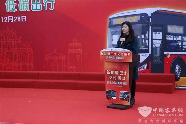 交付仪式上,南光澳巴总经理梁美玲作为新能源巴士使用方致辞,她表示,南光澳巴始终积极响应国家和特区政府环保政策,不断引进新能源及清洁能源巴士。今年在澳门特区政府交通事务局的指导及各方的支持和帮助下,顺利完成新车购置计划,率先大规模引进增程式新能源巴士,成为澳门首家大规模引进增程式新能源巴士的企业。在未来前进道路上,南光澳巴希望与各方继续保持深入合作和交流,共同推动澳门新能源巴士的更新,助力实现特区政府经济和社会发展二五规划,助力国家的双碳目标达成。