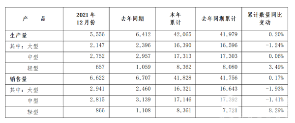 2022年1月5日,宇通客车披露2021年12月份产销数据快报。数据显示,2021年,宇通客车累计生产42065辆,同比增长0.2%,累计销售41828辆,同比增长0.17%。