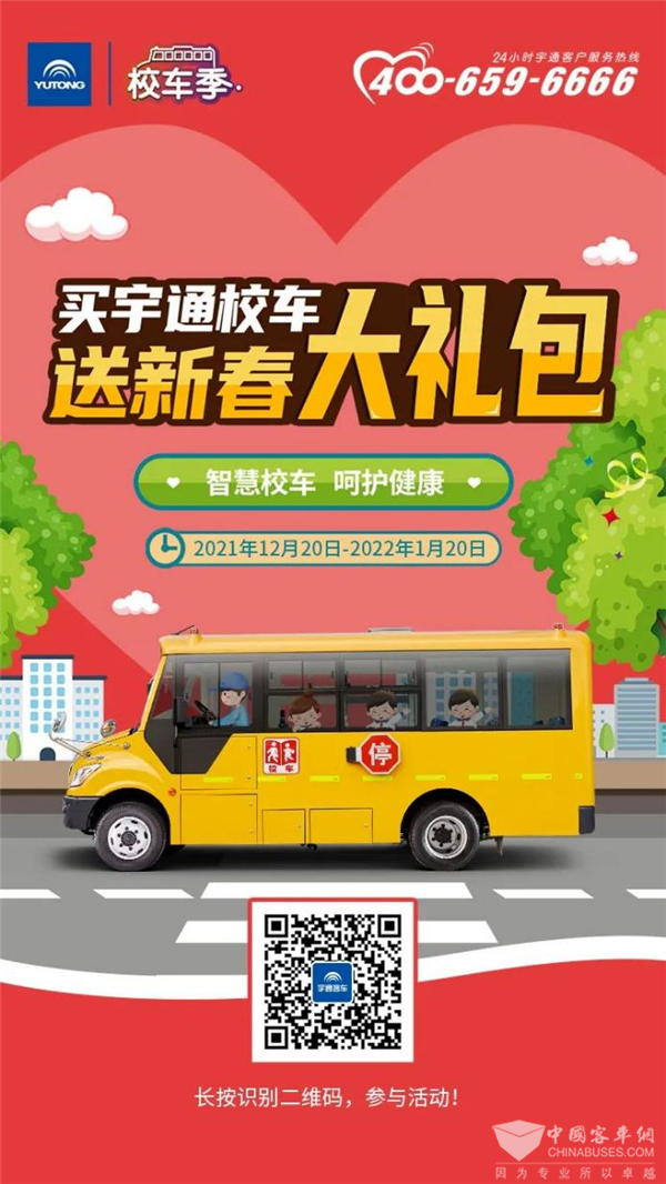 作为儿童安全的守护者,宇通用实际行动守护儿童健康成长,用卓越品质打造安全可靠的校车产品。当然,我们能稳步前行,与每一位用户的帮助和支持密切相关。为了感谢您一路与我们携手同行,2021年12月20日至2022年1月20日,宇通重磅推出“买宇通校车送新春大礼包”活动,购车送优惠,各种好礼等您来拿!