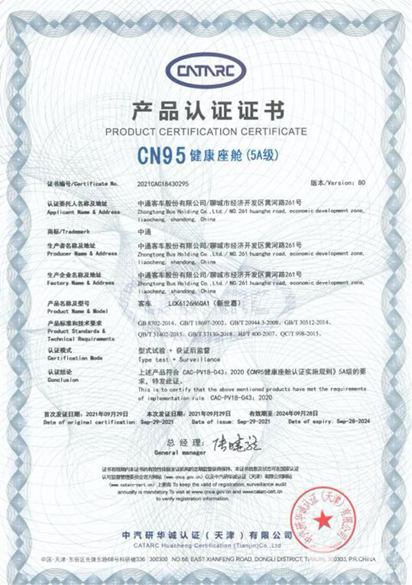 在公众普遍关注的健康、安全方面,10月初,中通客车新世嘉通过中汽研华诚认证(天津)有限公司“CN95健康座舱”5A级认证,这是国内首款获得该认证的旅团客车产品。据悉,中国汽车技术研究中心华诚认证的“CN95健康座舱认证”体系,包含清新空气、抗菌除菌、健康选材、低噪隔音、电磁洁净5个维度测评,为客户选购健康的车辆品牌提供专业依据,而中通新世嘉5个维度的测评结果,均达到最佳的A级水平。