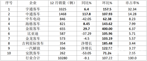 总体看,12月大中型新能源客车同比下降9.1%,环比增长107.22%,相对上月回暖明显。Top10中,销量同比6增4降、环比全部正增长;同比增长最大的是中通客车,环比增长最大的是金旅客车;环比、同比双增长的有宇通、中通、海格、金旅。从市场排名看,宇通客车位居第一,中通第二,中车电动居第三。