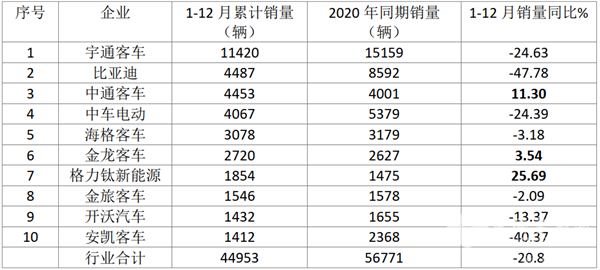 影响中国客车业|2021年度中大型新能源客车销售数据年度盘点