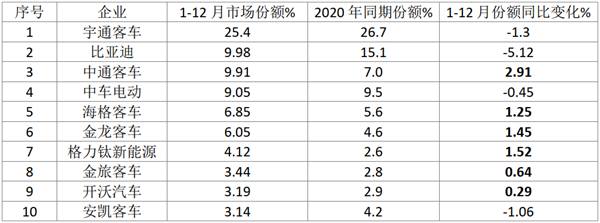 从上表看出,2021年1-12月新能源客车top10中市场份额变化特征: